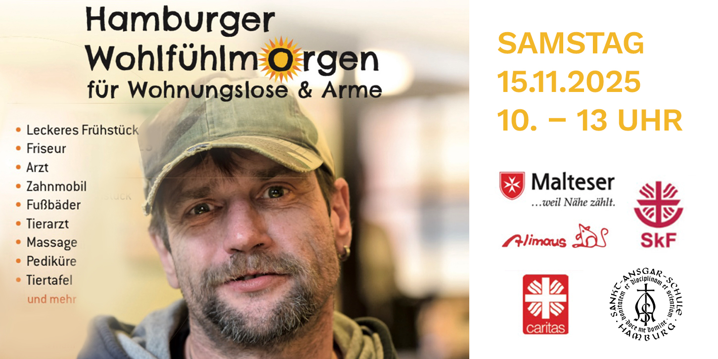 WOHLFÜHLMORGEN FÜR WOHNUNGSLOSE UND ARME am 15. November 2025, 10 – 13 Uhr in der Sankt-Ansgar-Schule, Bürgerweide 33, Hamburg-Borgfelde Der Wohlfühlmorgen für Wohnungslose und Arme ist eine Veranstaltung, die ein Zeichen der Toleranz setzen und zugleich den Menschen, die am…